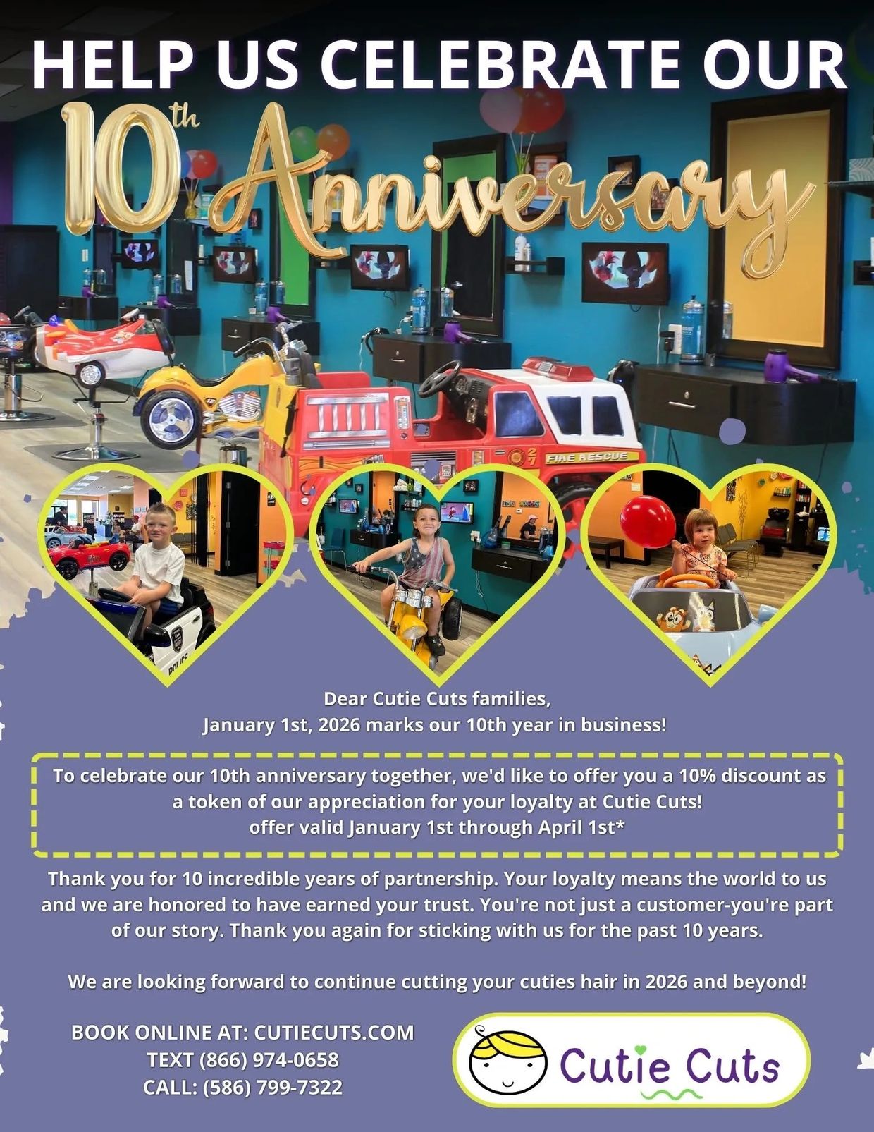 Cutie Cuts is locally owned and operated with 20 years of experience providing services for children. Our stylists have a combined 50+ years experience in working solely with children and we pride ourselves in being a unique fun salon for young children. We are proud to be serving families in the community and appreciate our customers for allowing us to share our passion and expertise.